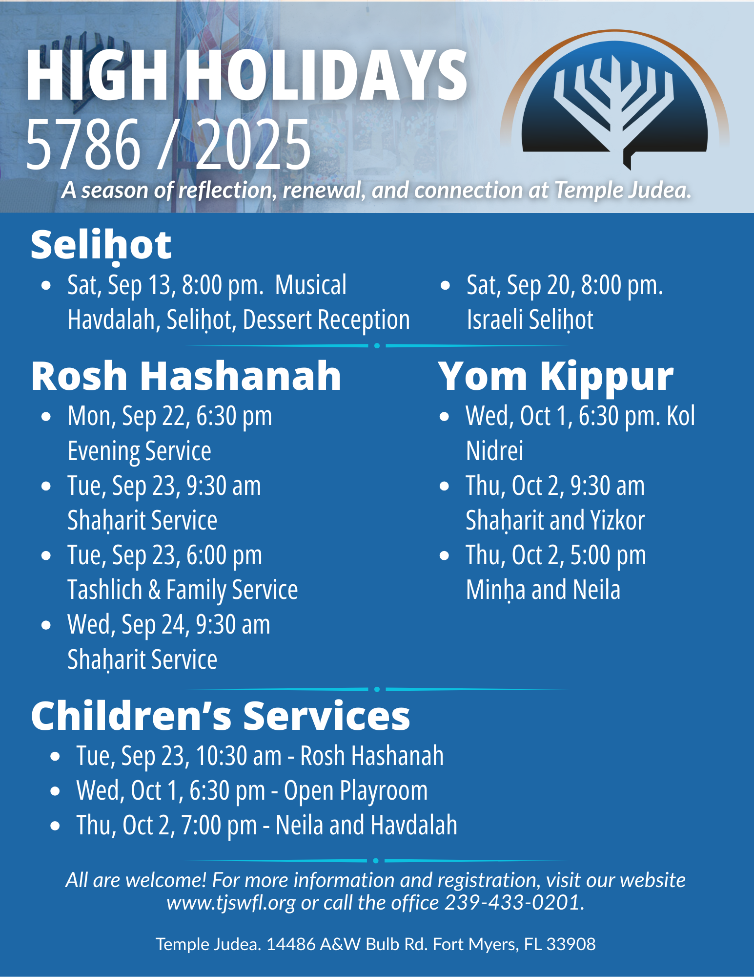 Temple Judea welcomes everyone interested in exploring their Jewish spirituality during the upcoming High Holidays and does not charge for tickets. If you are able and willing, you are invited to make a donation to Temple Judea by filling out the form below.